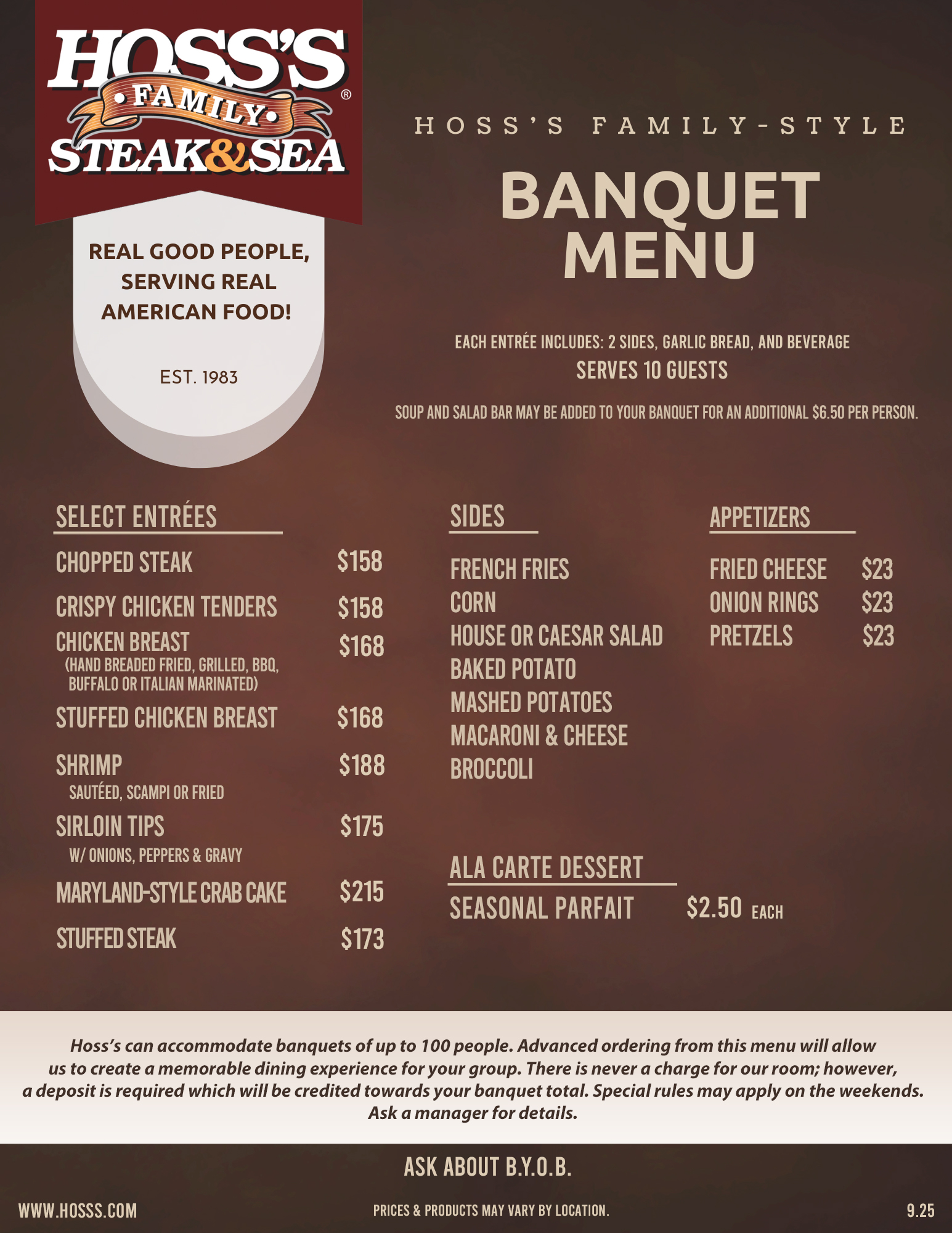 Birthday parties, banquets, anniversary parties, fundraisers, or community nights – whatever the event, Hoss’s makes the experience as special as the occasion.